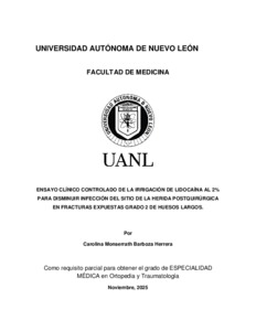 Barboza Herrera, Carolina Monserrtah (2025) Ensayo clínico controlado de la irrigación de lidocaína al 2% para disminuir infección del sitio de la herida postquirúrgica en fracturas expuestas grado 2 de huesos largos. Especialidad thesis, Universidad Autónoma de Nuevo León.