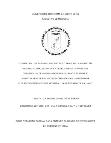 Páez Bueno, Miguel Angel (2025) Cambio en los parámetros eritrocitarios de la biometría hemática como signo en la detección anticipada del desarrollo de anemia adquirida durante el manejo hospitalario de pacientes internados en la unidad de cuidados intensivos del hospital universitario de la UANL. Especialidad thesis, Universidad Autónoma de Nuevo León.