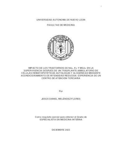 Conclusiones: Los trastornos electrolíticos son frecuentes entre los receptores de trasplante autólogo y alogénico de células hematopoyéticas (auto-TCPH y alo-TCPH, respectivamente), siendo la hiponatremia y la hipomagnesemia los más comunes. La hiponatremia fue más frecuente en el grupo de trasplante haploidéntico de células hematopoyéticas (haplo-TCPH), siendo la ciclofosfamida postrasplante un posible factor desencadenante. Los pacientes que desarrollan alteraciones electrolíticas presentan una menor supervivencia global, lo que subraya la necesidad de una monitorización estricta de los electrolitos tras el trasplante. Se requiere más investigación para confirmar el papel protector de la hipomagnesemia en los receptores de alo-TCPH.