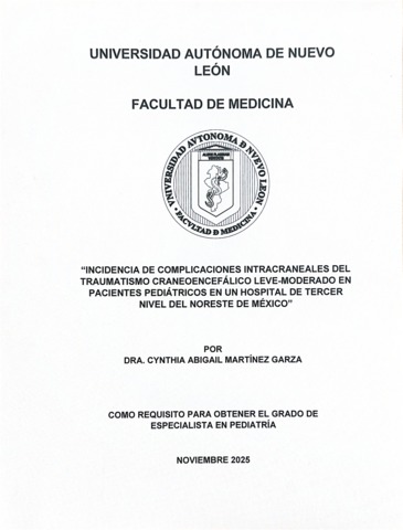 Martínez Garza, Cynthia Abigail (2025) Incidencia de complicaciones intracraneales del traumatismo craneoencefálico leve-moderado en pacientes pediátricos en un hospital de tercer nivel del noreste de México. Especialidad thesis, Universidad Autónoma de Nuevo León.