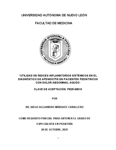 Márquez Caballero, Diego Alejandro (2025) Utilidad de índices inflamatorios sistémicos en el diagnóstico de apendicitis en pacientes pediátricos con dolor abdominal agudo. Especialidad thesis, Universidad Autónoma de Nuevo León.