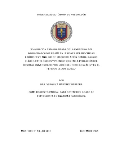 Martínez Herrera, Verónica (2025) Evaluación estandarizada de la expresión del inmunomarcador prame en lesiones melanocíticas limítrofes y análisis de su correlación con hallazgos clínico-patológicos y pronósticos en la población del hospital universitario Dr. José Eleuterio González en el periodo de 2016 a 2023. Especialidad thesis, Universidad Autónoma de Nuevo León.