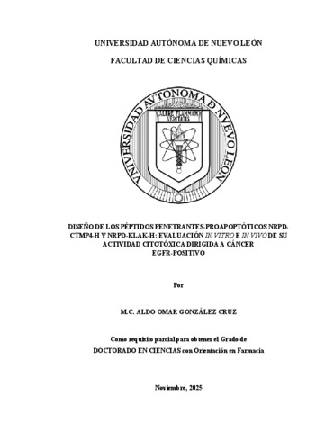 González Cruz, Aldo Omar (2025) Diseño de los péptidos penetrantes-proapoptóticos NRPD-CTMP4-H y NRPD-KLAK-H: evaluación in vitro e in vivo de su actividad citotóxica dirigida a cáncer EGFR-positivo. Doctorado thesis, Universidad Autónoma de Nuevo León.