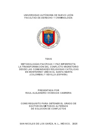 Viviescas Cabrera, Raúl Alejandro (2025) Metodologías pacíficas y paz imperfecta: la transformación del conflicto migratorio desde las comunidades religiosas católicas en Monterrey (México), Santa Marta (Colombia) y Sevilla (España). Doctorado thesis, Universidad Autónoma de Nuevo León.