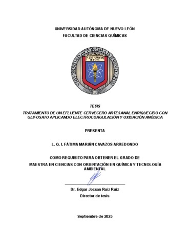 Cavazos Arredondo, Fátima Marián (2025) Tratamiento de un efluente cervecero artesanal enriquecido con glifosato aplicando electrocoagulación y oxidación anódica. Maestría thesis, Universidad Autónoma de Nuevo León.