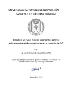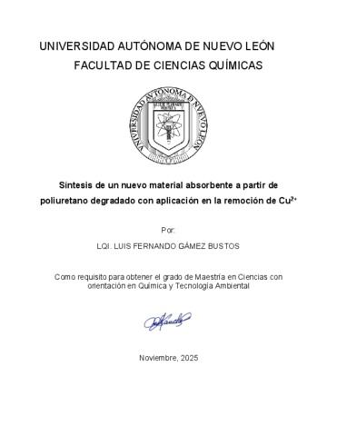 Gámez Bustos, Luis Fernando (2025) Síntesis de un nuevo material absorbente a partir de poliuretano degradado con aplicación en la remoción de Cu2+. Maestría thesis, Universidad Autónoma de Nuevo León.