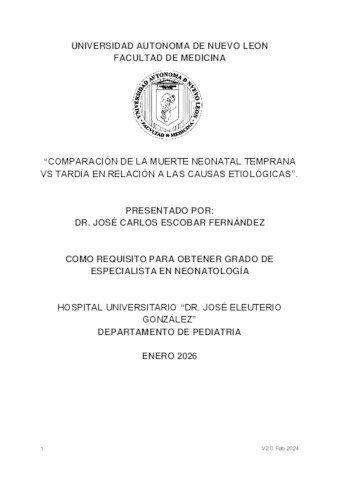Escobar Fernández, José Carlos (2026) Comparación d la muerte neonatal temprana vs tardía en relación a las causas etiológicas. Especialidad thesis, Universidad Autónoma de Nuevo León.