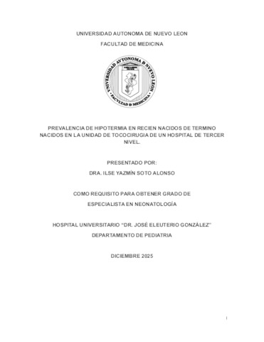 Soto Alonso, Ilse Yazmín (2026) Prevalencia de hipotermia en recién nacidos de término nacidos en la unidad de tococirugía de un hospital de tercer nivel NIVEL. Especialidad thesis, Universidad Autónoma de Nuevo León.